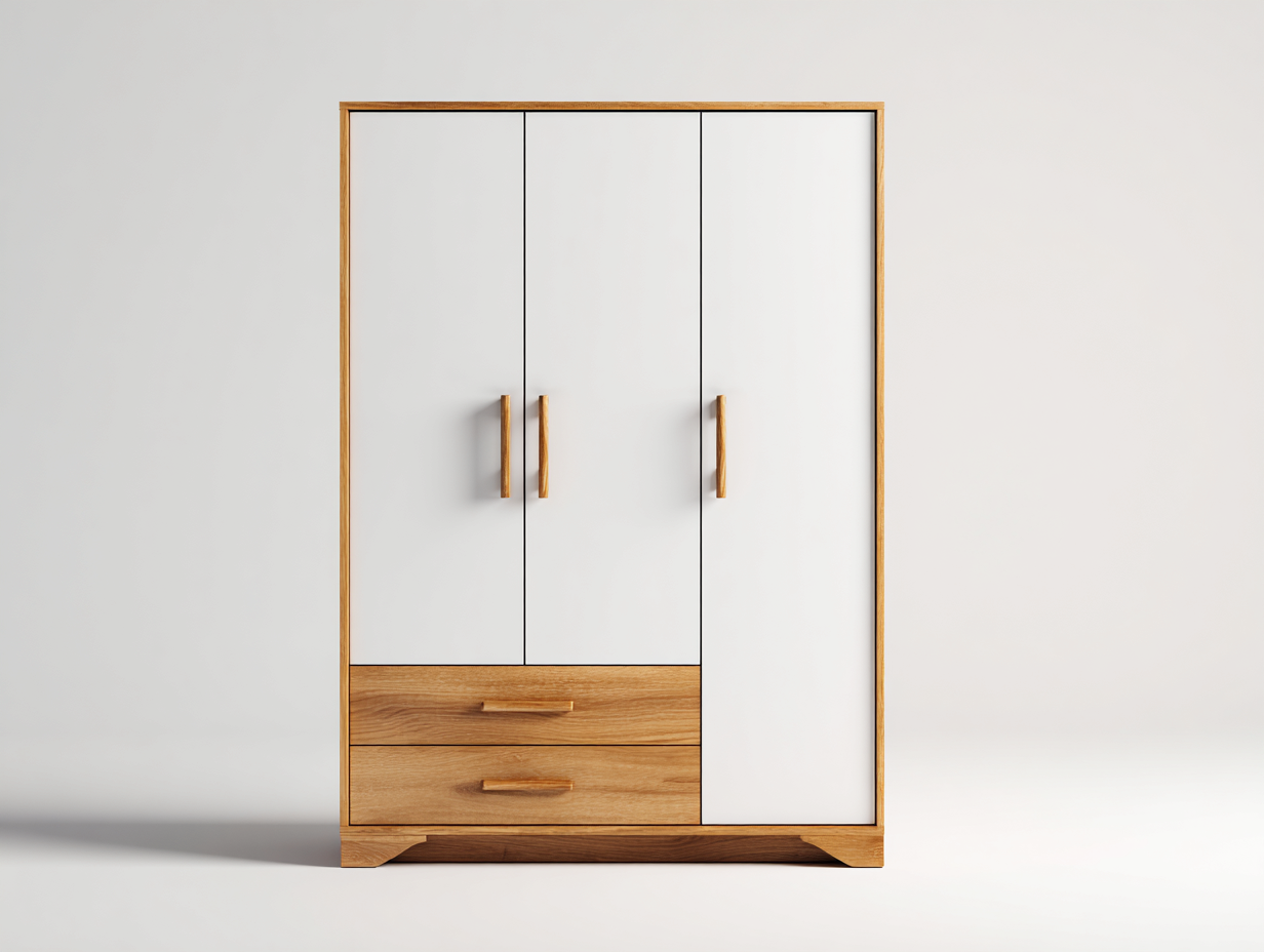Armadio a 3 ante dallo stile moderno nordico, progettato per offrire una soluzione equilibrata tra estetica naturale e funzionalita quotidiana. Le superfici bianche abbinate agli elementi in tonalita rovere conferiscono un aspetto luminoso e accogliente alla camera da letto.
