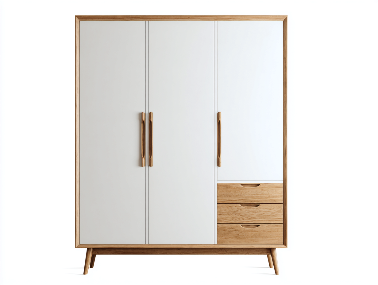 Armadio a 3 ante dal design moderno pensato per l'organizzazione funzionale della camera da letto. Le superfici chiare abbinate alla struttura in tonalita rovere creano un equilibrio visivo elegante e adatto a diversi contesti abitativi.