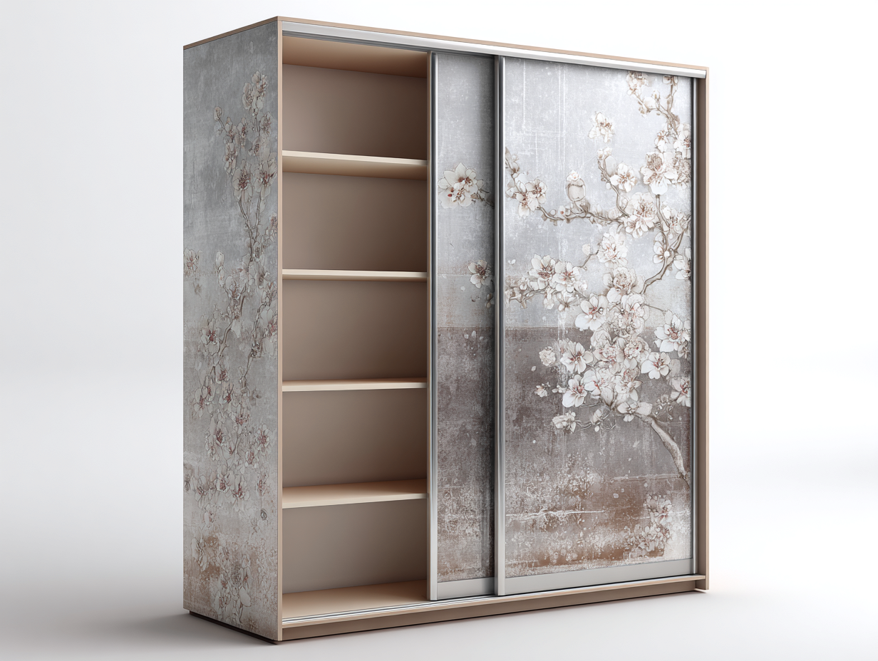 Armadio con ante scorrevoli dallo stile moderno decorativo, pensato per unire funzionalita e valore estetico nella camera da letto. I pannelli decorati con motivo floreale creano un effetto visivo elegante e armonioso.